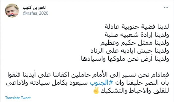 وقال في تغريدة عبر "تويتر" رصدها "كالمشهد العربي": "لدينا قضية جنوبية عادلة وإرادة شعبيه صلبة وممثل حكيم وعظيم وجيش أياديه على الزناد وأرض نحن ملوكها وأسيادها".
