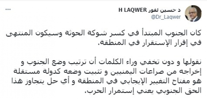 وأوضح أننا: "نقولها ودون تخفي وراء الكلمات أن ترتيب وضع الجنوب وإخراجه من صراعات اليمنيين وتثبيت وضعه كدولة مستقلة هو مفتاح التغيير الإيجابي في المنطقة"، معتبرا أن: "أي حل يتجاوز هذا الحق الجنوبي يعني استمرار الحرب".