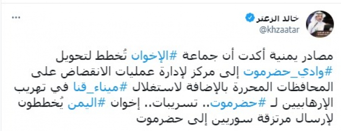 ولفت في تغريدة على حسابه بموقع التدوين المصغر تويتر، اليوم إلى أن: "مصادر يمنية أكدت أن جماعة الإخوان تُخطط لتحويل وادي حضرموت إلى مركز لإدارة عمليات الانقضاض على المحافظات المحررة".