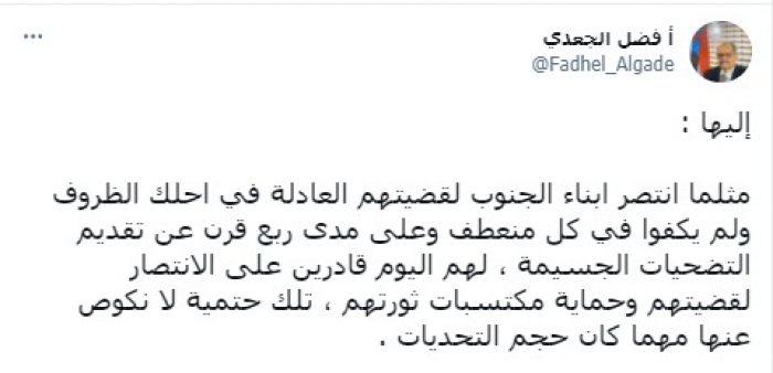 وقال في تغريدة على حسابه بموقع التدوين المصغر تويتر، اليوم إنه: "مثلما انتصر أبناء الجنوب لقضيتهم العادلة في أحلك الظروف ولم يكفوا في كل منعطف وعلى مدى ربع قرن عن تقديم التضحيات الجسيمة، لهم اليوم قادرون على الانتصار لقضيتهم وحماية مكتسبات ثورتهم".