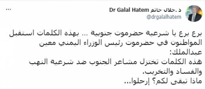 وقال في تغريدة على حسابه بموقع التدوين المصغر تويتر، اليوم : "برع برع يا شرعية حضرموت جنوبية، بهذه الكلمات استقبل المواطنون في حضرموت رئيس الوزراء اليمني معين عبدالملك".