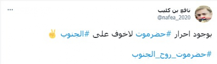 وأشار في تغريدة على حسابه بموقع التدوين المصغر تويتر، اليوم إلى أنه: "بوجود أحرار حضرموت لاخوف على الجنوب"، مختتما بهاشتاج: "حضرموت روح الجنوب".