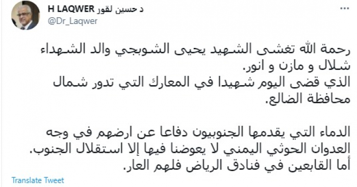 وكتب في تغريدة عبر "تويتر" رصدها "المشهد العربي": "رحمة الله تغشى الشهيد يحيى الشوبجي والد الشهداء شلال ومازن وأنور. الذي قضى اليوم شهيدًا في المعارك التي تدور شمال محافظة الضالع".
