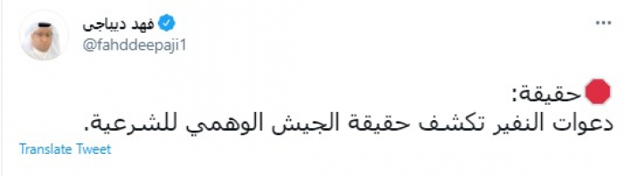 وكتب في تغريدة عبر "تويتر" رصدها "المشهد العربي": "دعوات النفير تكشف حقيقة الجيش الوهمي للشرعية".