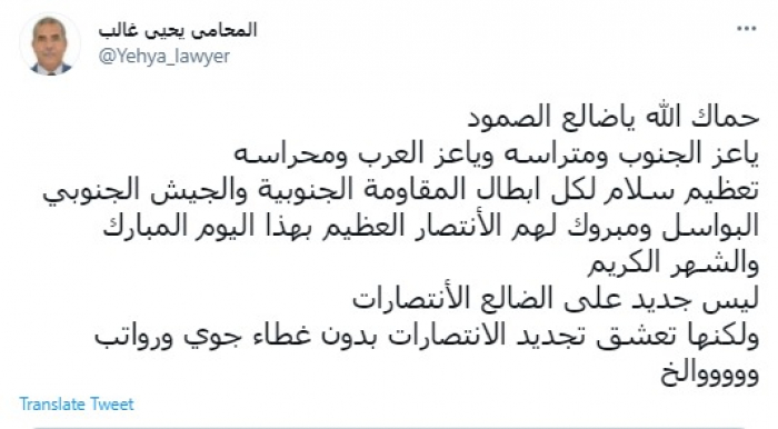 وكتب في تغريدة عبر "تويتر" رصدها "المشهد العربي": "حماك الله ياضالع الصمود ياعز الجنوب ومتراسه وياعز العرب ومحراسه".