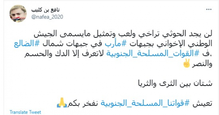وكتب في تغريدة عبر "تويتر" رصدها "المشهد العربي": "لن يجد الحوثي تراخي ولعب وتمثيل ما يسمى الجيش الوطني الإخواني بجبهات مأرب في جبهات شمال الضالع فالقوات المسلحة الجنوبية لا تعرف إلا الدك والحسم والنصر".