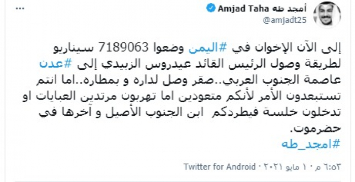 وكتب "طه" تغريدة عبر تويتر، رصدها "المشهد العربي": "إلى الآن الإخوان في اليمن وضعوا 7189063 سيناريو لطريقة وصول الرئيس القائد عيدروس الزبيدي، إلى عدن عاصمة الجنوب العربي".