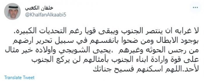 وكتب في تغريدة عبر "تويتر" رصدها "المشهد العربي": "لا غرابة أن ينتصر الجنوب ويبقى قويًا رغم التحديات الكبيرة".