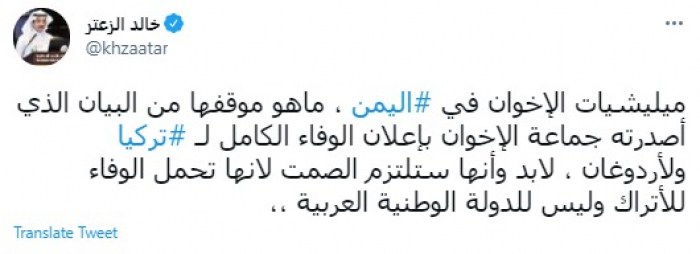 وجه المحلل السياسي السعودي خالد الزعتر، اليوم، تساؤلًا ناريًا لجماعة الإخوان الإرهابية في اليمن بشأن بيان التنظيم الدولي للإخوان الأخير وإعلانه الوفاء الكامل لتركيا.