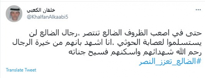 واختتم تغريدته قائلًا: "الضالع تعزز النصر".