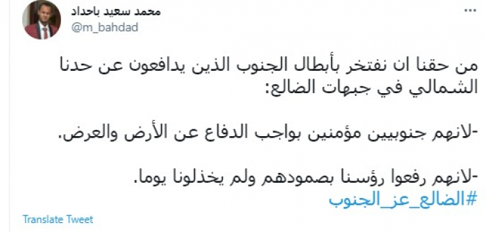 وقال في تغريدة عبر "تويتر" رصدها "المشهد العربي": "من حقنا ان نفتخر بأبطال الجنوب الذين يدافعون عن حدنا الشمالي في جبهات الضالع".