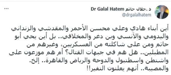 وتساءل في تغريدة على حسابه بموقع التدوين المصغر تويتر، اليوم: "أين أبناء هادي وعلي محسن الأحمر والمقدشي والزنداني واليدومي والآنسي وبن دغر والمخلافي؟، بل أين يحيى أبو حاتم ومن على شاكلته من العسكريين، وغيرهم من المطبلين؟".