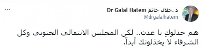 وقال في تغريدة على حسابه بموقع التدوين المصغر تويتر، اليوم: "هم خذلوكِ يا عدن"، مستدركا: "لكن المجلس الانتقالي الجنوبي وكل الشرفاء لا يخذلونك أبدا".