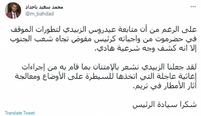 وأضاف: "لقد جعلنا الزُبيدي نشعر بالامتنان بما قام به من إجراءات إغاثية عاجلة التي اتخذها للسيطرة على الأوضاع ومعالجة آثار الأمطار في تريم".