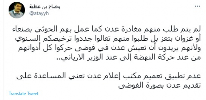 حذر الكاتب الصحفي وضاح بن عطية، اليوم، من عدم تطبيق تعميم مكتب إعلام عدن.