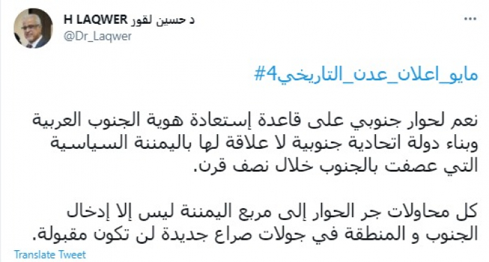 وقال في تغريدة عبر "تويتر" رصدها "المشهد العربي": "4 مايو إعلان عدن التاريخي".