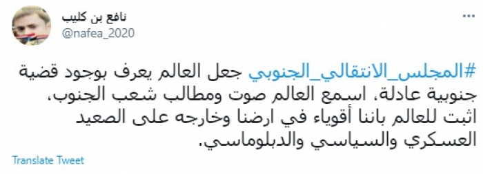 وكتب في تغريدة عبر "تويتر" رصدها "المشهد العربي": المجلس الانتقالي الجنوبي جعل العالم يعرف بوجود قضية جنوبية عادلة، اسمع العالم صوت ومطالب شعب الجنوب".