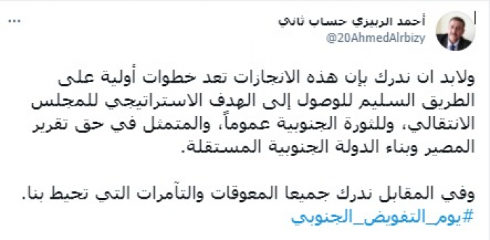 وأضاف أنه: "في المقابل ندرك جميعا المعوقات والتآمرات التي تحيط بنا"، مختتما: "يوم التفويض الجنوبي".