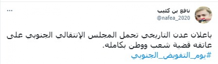 وقال في تغريدة على حسابه بموقع التدوين المصغر تويتر، اليوم إنه: "بإعلان عدن التاريخي تحمل المجلس الانتقالي الجنوبي على عاتقه قضية شعب ووطن بكامله"، مختتما: "يوم التفويض الجنوبي".