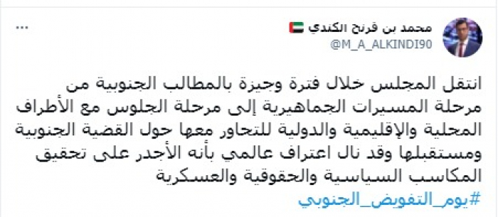 وأكد في تغريدة على حسابه بموقع التدوين المصغر تويتر، اليوم أنه: "انتقل المجلس خلال فترة وجيزة بالمطالب الجنوبية من مرحلة المسيرات الجماهيرية إلى مرحلة الجلوس مع الأطراف المحلية والإقليمية والدولية للتحاور معها حول القضية الجنوبية ومستقبلها".