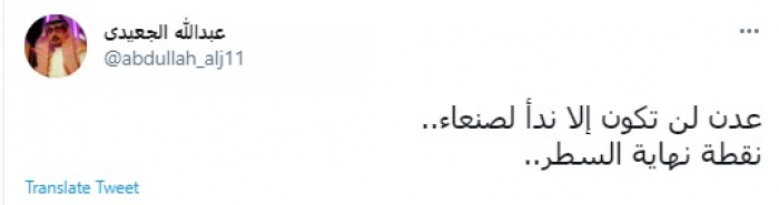 وكتب في تغريدة عبر "تويتر" رصدها "المشهد العربي": "عدن لن تكون إلا ندًا لصنعاء.. نقطة نهاية السطر".