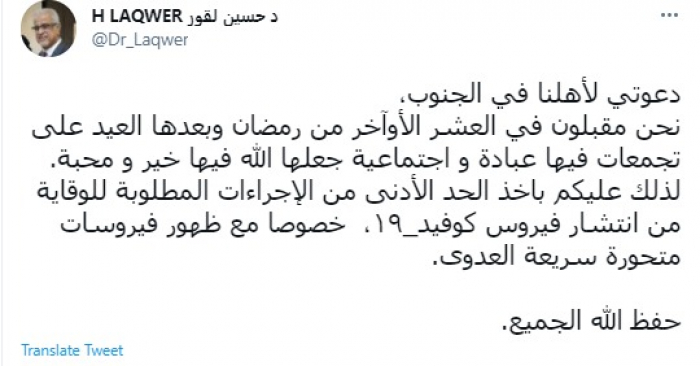 وقال في تغريدة عبر "تويتر" رصدها "المشهد العربي": "دعوتي لأهلنا في الجنوب، نحن مقبلون في العشر الأوآخر من رمضان وبعدها العيد على تجمعات فيها عبادة و اجتماعية جعلها الله فيها خير ومحبة".
