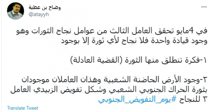 وأضاف: "وجود الأرض الحاضنة الشعبية وهذان العاملان موجودان بثورة الحراك الجنوبي الشعبي وشكل تفويض الزُبيدي العامل 3 للنجاح".