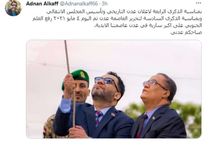 وأضاف: "تم اليوم 4 مايو 2021 رفع العلم الجنوبي على أكبر سارية في عدن عاصمتنا الأبدية.. صباحكم عدني".
