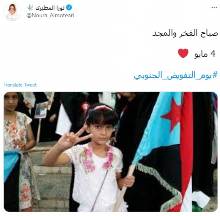 تفاعلت الكاتبة والباحثة نورا المطيري، اليوم، مع هاشتاج "يوم التفويض الجنوبي".