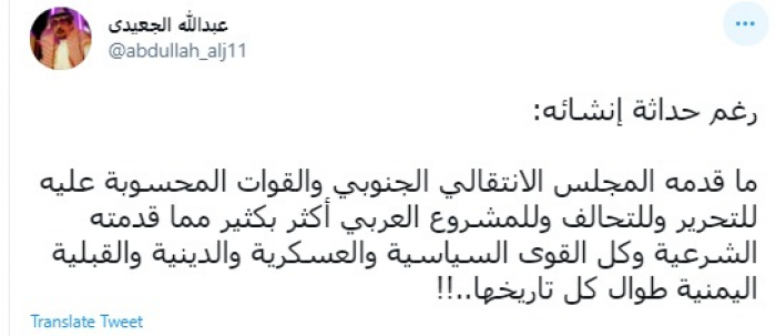 وكتب في تغريدة عبر "تويتر" رصدها "المشهد العربي": "رغم حداثة إنشائه: ما قدمه المجلس الانتقالي الجنوبي والقوات المحسوبة عليه للتحرير وللتحالف وللمشروع العربي أكثر بكثير مما قدمته الشرعية وكل القوى السياسية والعسكرية والدينية والقبلية اليمنية طوال كل تاريخها".