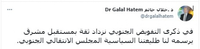 وأشار في تغريدة على حسابه بموقع التدوين المصغر تويتر، اليوم إلى أنه: "في ذكرى التفويض الجنوبي نزداد ثقة بمستقبل مشرق يرسمه لنا طليعتنا السياسية المجلس الانتقالي الجنوبي".