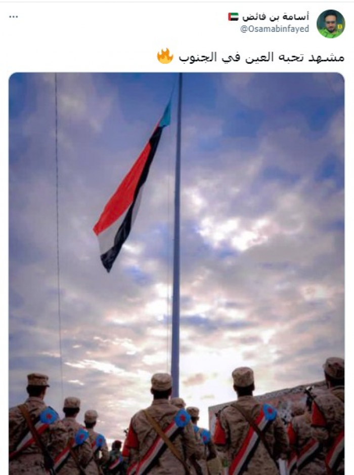وصف الكاتب الصحفي أسامة بن فائض، رفع علم الجنوب في العاصمة عدن، بأنه مشهد تحبه العين.