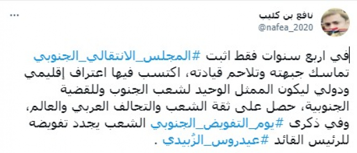 وقال في تغريدة على حسابه بموقع التدوين المصغر تويتر، اليوم إنه: "في أربع سنوات فقط أثبت المجلس الانتقالي الجنوبي تماسك جبهته وتلاحم قيادته".