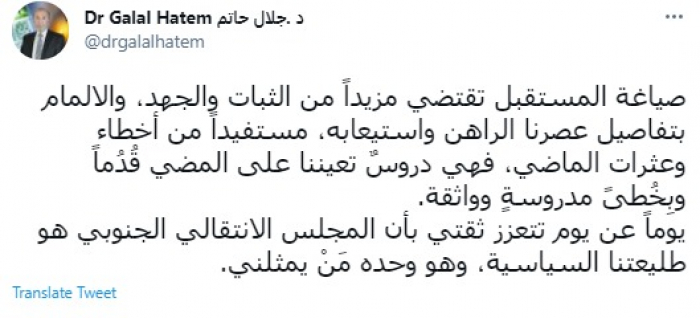 حاتم: ثقتنا تتعزز في الانتقالي.. وهو طليعتنا السياسية