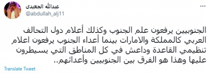 وقال في تغريدة عبر "تويتر" رصدها "المشهد العربي": "الجنوبيون يرفعون علم الجنوب وكذلك أعلام دول التحالف العربي كالمملكة والإمارات".