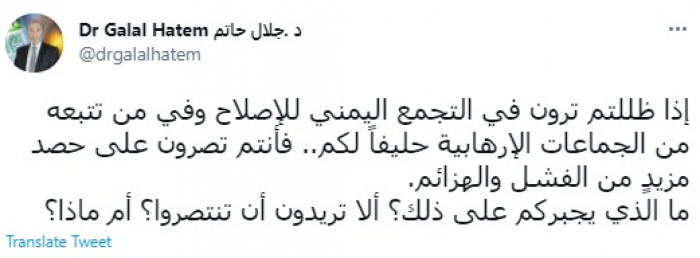 حاتم: استمرار التعاون مع حزب الإصلاح يعني المزيد من الفشل والهزائم