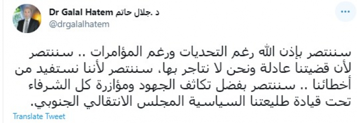 وأضاف: "سننتصر بفضل تكاثف الجهود ومؤازرة كل الشرفاء تحت قيادة طليعتنا السياسية المجلس الانتقالي الجنوبي".