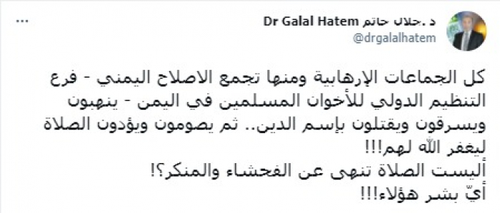 أكد الدكتور جلال حاتم، رئيس جامعة أم القيوين الإماراتية، أن التنظيمات الدينية وعلى رأسها الإخوان في اليمن، تسرق وتنهب وتقتل باسم الدين.