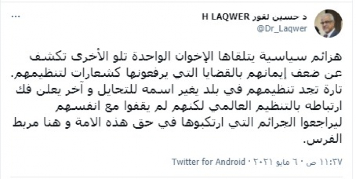 وكتب "لقور" تغريدة عبر تويتر، رصدها "المشهد العربي": "هزائم سياسية يتلقاها الإخوان الواحدة تلو الأخرى تكشف عن ضعف إيمانهم بالقضايا التي يرفعونها كشعارات لتنظيمهم".