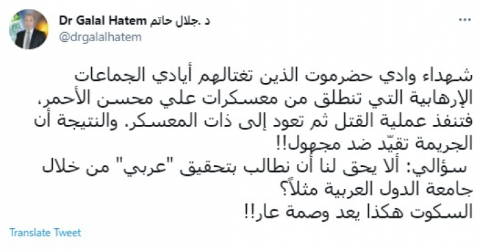 حاتم: وقائع الاغتيال بوادي حضرموت تأتي على يد المليشيات التابعة لمعسكرات الإرهاب الأحمر