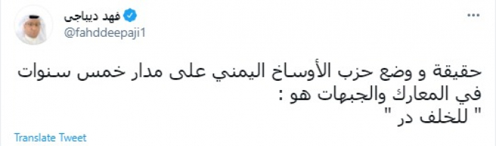 وقال في تغريدة عبر "تويتر" رصدها "المشهد العربي": "حقيقة ووضع حزب .... اليمني على مدار خمس سنوات في المعارك والجبهات هو: للخلف در".