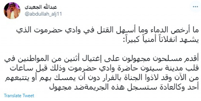 وقال في تغريدة عبر "تويتر" رصدها "المشهد العربي": "ما أرخص الدماء وما أسهل القتل في وادي حضرموت الذي يشهد انفلاتا أمنيا كبيرا: أقدم مسلحون مجهولون على اغتيال اثنين من المواطنين في قلب مدينة سيئون حاضرة وادي حضرموت وذلك قبل ساعات من الآن وقد لاذوا الجناة بالفرار دون أن يمسك بهم أو يتتبعهم أحد وكالعادة ستسجل هذه الجريمة ضد مجهول".