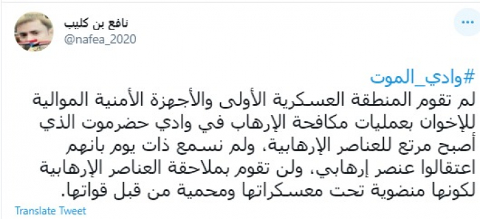 وكتب في تغريدة عبر "تويتر" رصدها "المشهد العربي": "وادي الموت.. لم تقوم المنطقة العسكرية الأولى والأجهزة الأمنية الموالية للإخوان بعمليات مكافحة الإرهاب في وادي حضرموت الذي أصبح مرتع للعناصر الإرهابية".