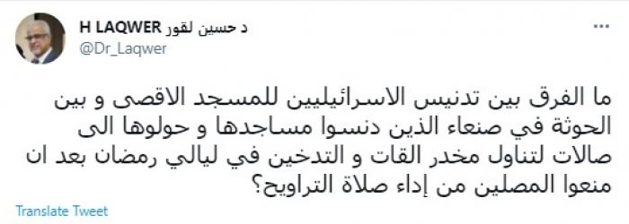 وقال في تغريدة عبر "تويتر" رصدها "المشهد العربي": "ما الفرق بين تدنيس الإسرائيليين للمسجد الأقصى وبين الحوثة في صنعاء الذين دنسوا مساجدها وحولوها إلى صالات لتناول مخدر القات والتدخين في ليالي رمضان بعد ان منعوا المصلين من أداء صلاة التراويح؟".