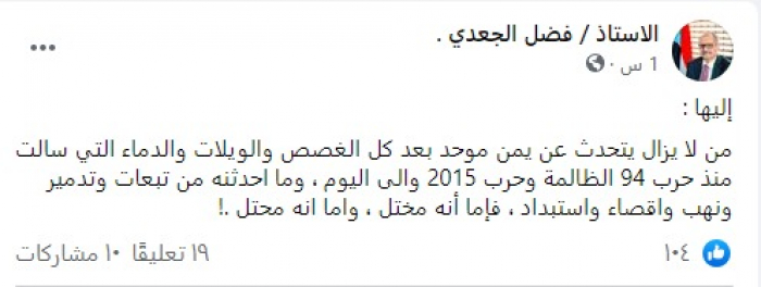 وكتب "الجعدي" تغريدة عبر حسابه بتويتر، رصدها "المشهد العربي": "من لا يزال يتحدث عن يمن موحد بعد كل الغصص والويلات والدماء التي سالت منذ حرب 94 الظالمة وحرب 2015 وإلى اليوم".