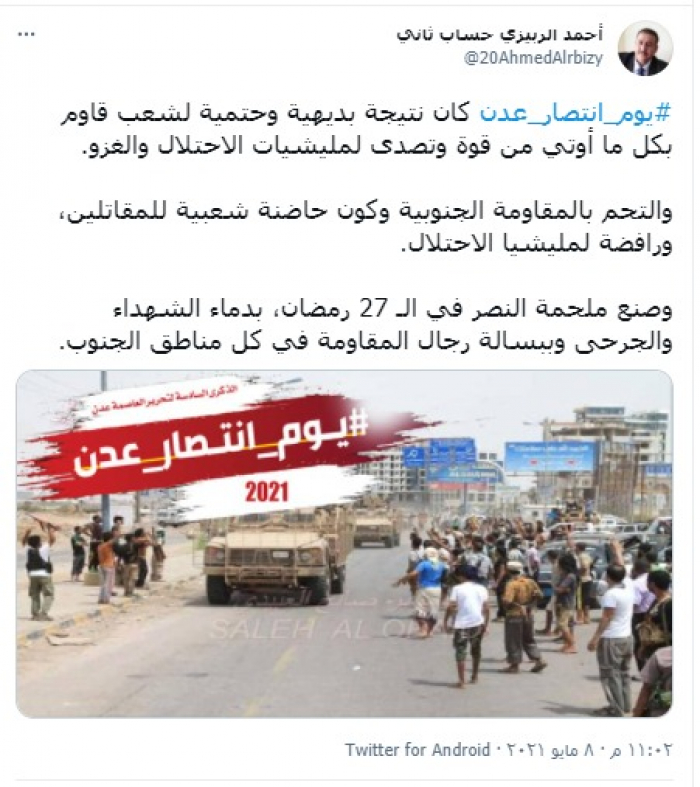 وكتب "الربيزي" تغريدة عبر تويتر، رصدها "المشهد العربي": "يوم انتصار عدن كان نتيجة بديهية وحتمية لشعب قاوم بكل ما أوتي من قوة وتصدى لمليشيات الاحتلال والغزو، والتحم بالمقاومة الجنوبية وكون حاضنة شعبية للمقاتلين، ورافضة لمليشيا الاحتلال".