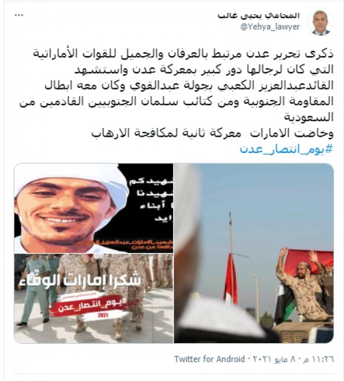 توجه الناشط السياسي المحامي يحيى غالب، بالتحية لدولة الإمارات وقواتها المسلحة وقيادتها الرشيدة لما قدموه من دور مشرف وبطولي في معركة عدن حتى انتهت بالنصر، وأحيا غالب ذكرى استشهاد القائد عبد العزيز الكعبي وشهداء القوات المسلحة الجنوبية.