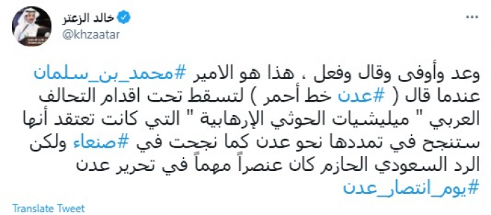 وقال في تغريدة عبر "تويتر" رصدها "المشهد العربي": "وعد وأوفى وقال وفعل ، هذا هو الأمير محمد بن سلمان عندما قال (عدن خط أحمر) لتسقط تحت أقدام التحالف العربي مليشيات الحوثي الإرهابية التي كانت تعتقد أنها ستنجح في تمددها نحو عدن كما نجحت في صنعاء".