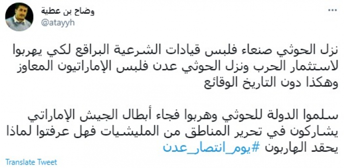 وكتب في تغريدة عبر "تويتر" رصدها "المشهد العربي": "نزل الحوثي صنعاء فلبس قيادات الشرعية البراقع لكي يهربوا لاستثمار الحرب ونزل الحوثي عدن فلبس الإماراتيون المعاوز وهكذا دون التاريخ الوقائع".