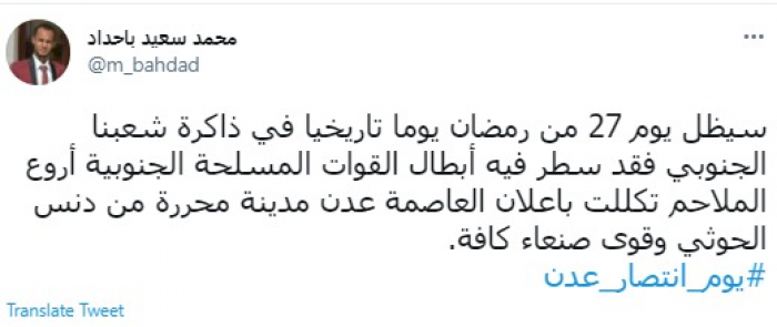 وكتب في تغريدة عبر "تويتر" رصدها "المشهد العربي": "سيظل يوم 27 من رمضان يومًا تاريخيًا في ذاكرة شعبنا الجنوبي فقد سطر فيه أبطال القوات المسلحة الجنوبية أروع الملاحم تكللت بإعلان العاصمة عدن مدينة محررة من دنس الحوثي وقوى صنعاء كافة".